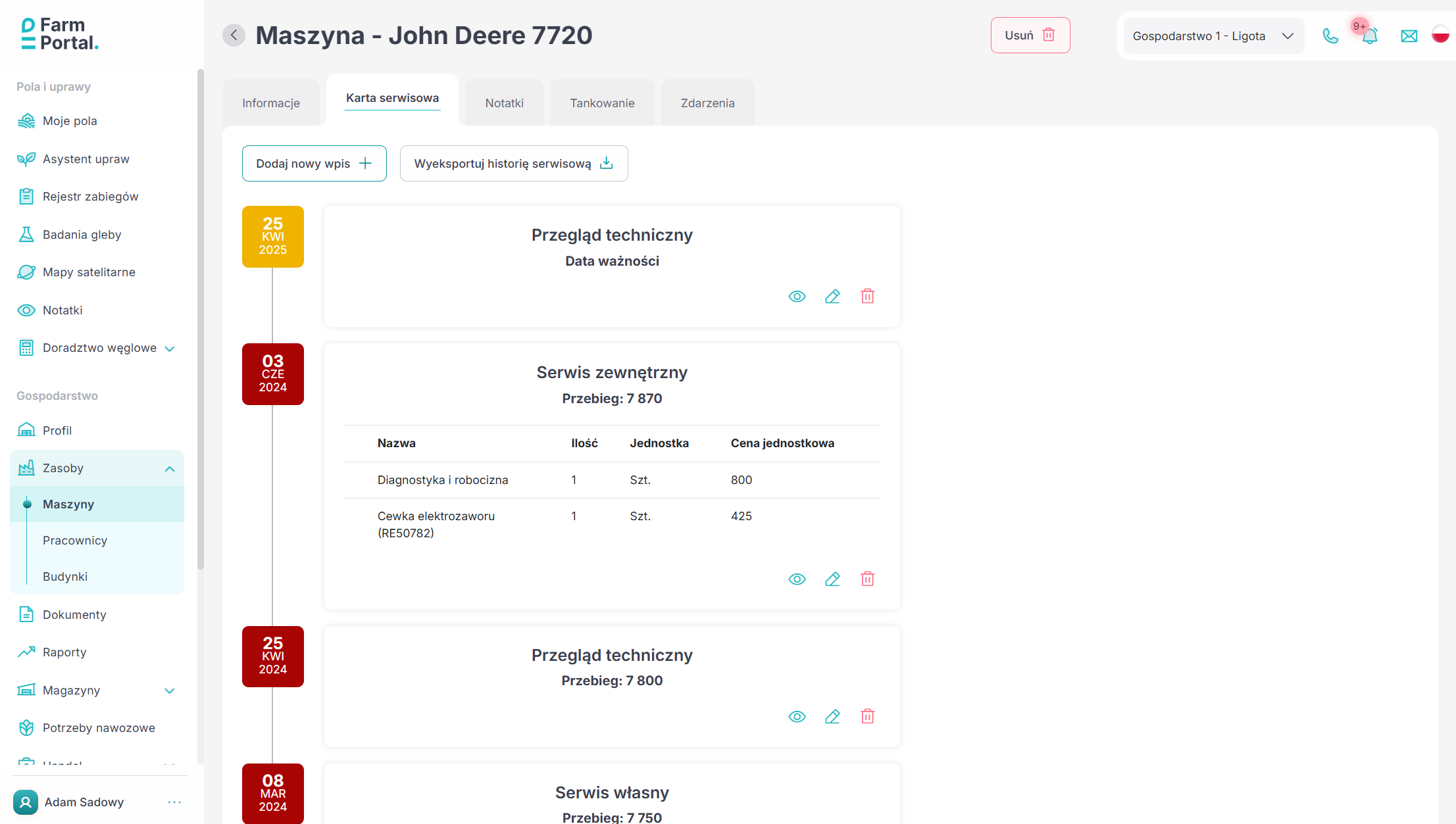 - Planowanie prac maszyn w połączeniu z rejestrem zabiegów agrotechnicznych wraz kosztami i wyznaczaniem operatora maszyny