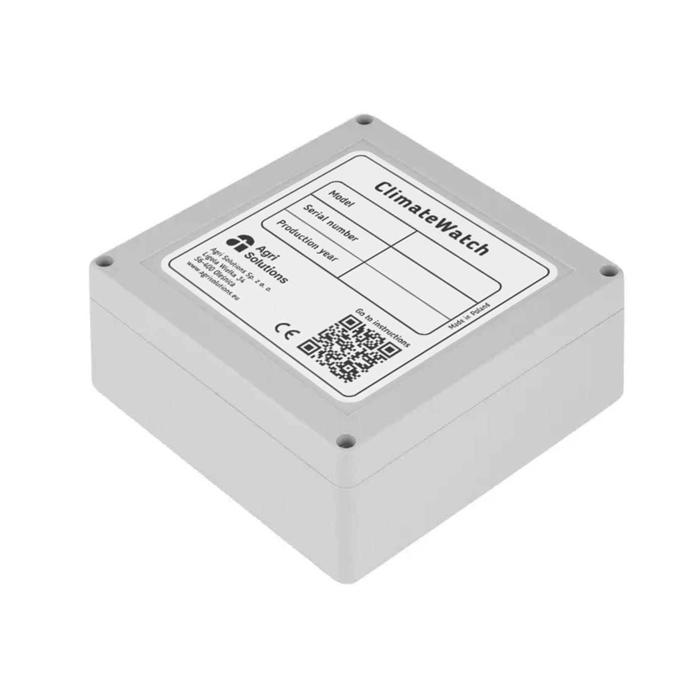 ClimateWatch to bezprzewodowy system ciągłego monitoringu mikroklimatu, który pomaga utrzymać właściwe warunki w przechowalniach, magazynach, tunelach foliowych, pryzmach i kopcach. Urządzenie mierzy temperaturę i wilgotność powietrza, wysyła alerty po przekroczeniu progów, a wszystkie dane trafiają do aplikacji FarmPortal, gdzie ClimateWatch można przypisać do konkretnych budynków i analizować w czasie.